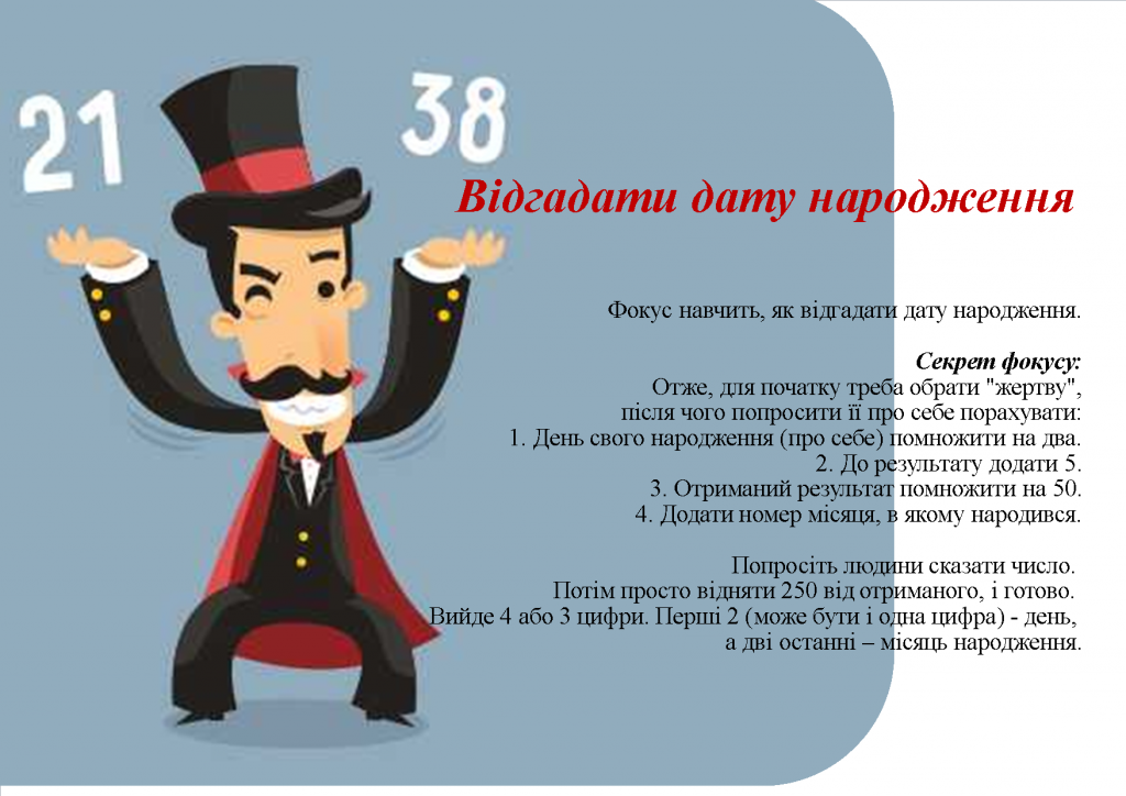 Дитині пропонується вивчити послідовність виконання кожного фокуса й продемонструвати його рідним або друзям. Виконуючи завдання, дитина потренує навички усного рахунку, розвине увагу, математичну компетенцію й комунікативні навички. Завдання покликані посилити інтерес до вивчення математики, демонструють різноманітні можливості застосування знань.