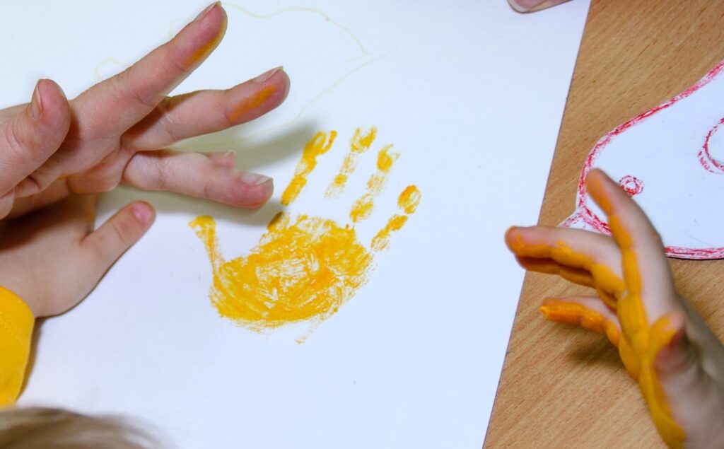 Коли дитина торкається фарби долонями й залишає сліди на папері, вона здійснює активне дослідження навколишнього середовища через кінестетичне та тактильне сприйняття. Цей процес сприяє розвитку сенсорної інтеграції, зорово-моторної координації та стійкості уваги, а також формує мотивацію до взаємодії з матеріалами і простором. Принципово важливо, що така діяльність є безоцінною: дитина не може «зробити неправильно», що знижує тривогу й підвищує готовність до нового досвіду.